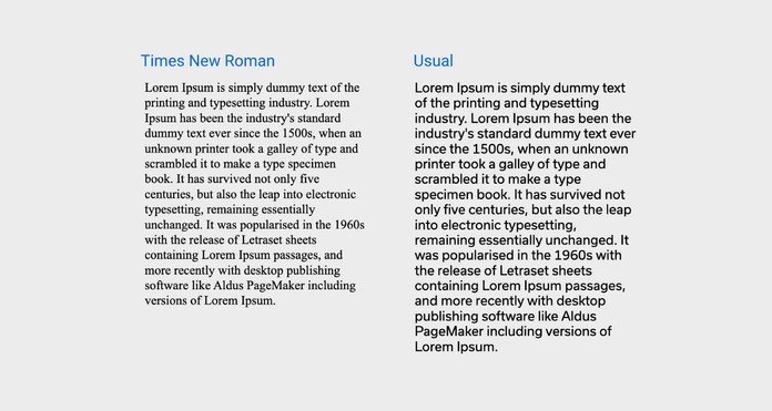 This example compares two fonts—Times New Roman and a custom font called Usual. Both fonts have a font size of 16px and a line height of 1.2 but notice the difference in length they have for the same text.