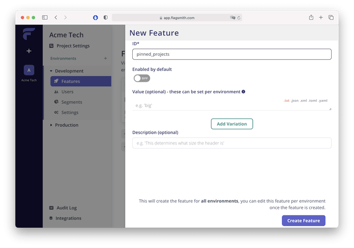 The configuration process is simple. Once you've signed up, create a new project. In Flagsmith you can define multiple environments per project, each environment keeps its own features/users/segments and API key.
