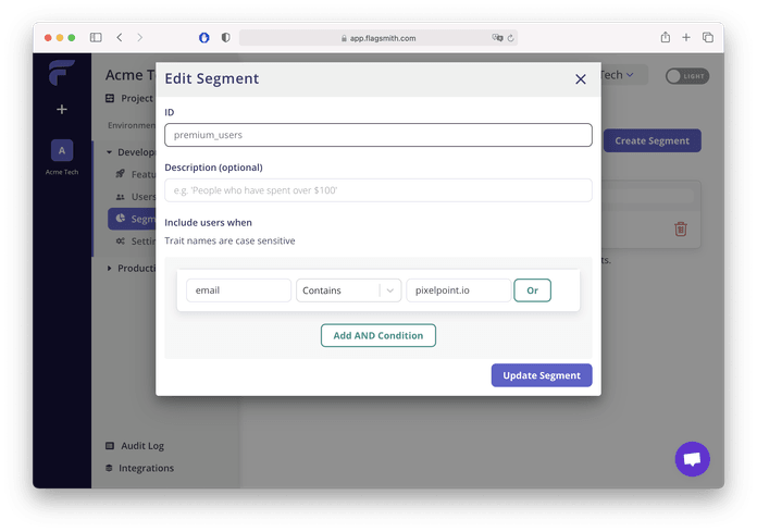 Let's create first segment and call it beta_opt_in . Go to Segments → Create Segment. Here you also could define an expression based on the trait which will add users that match that condition to the segment. We can start from a simple one, such as if email has [pixelpoint.io](http://pixelpoint.io) consider them as opted-in for beta features.